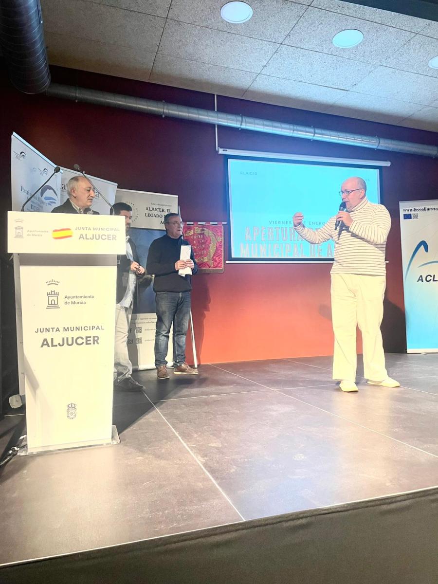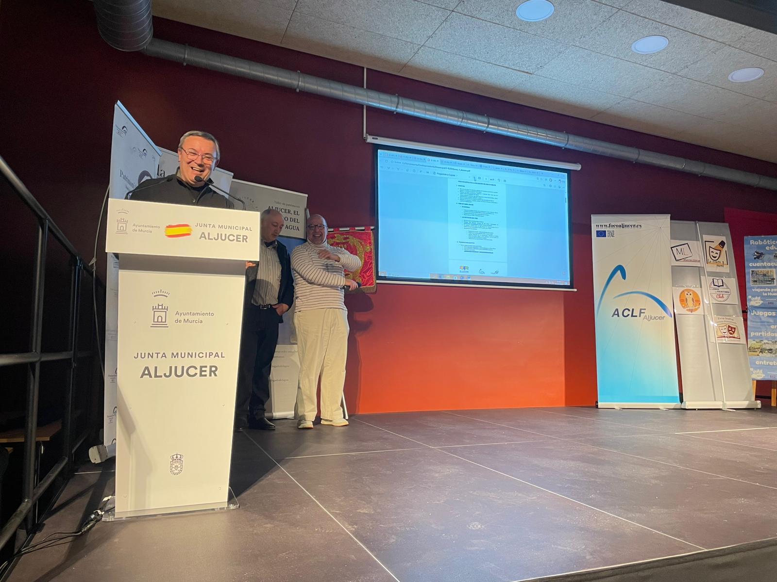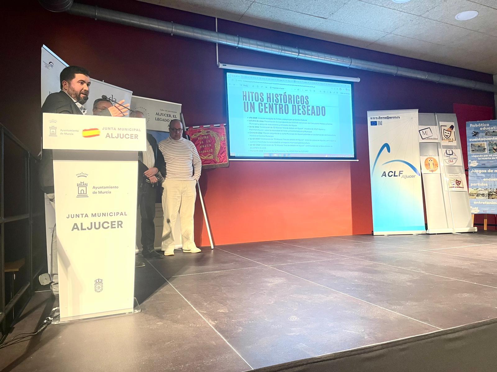 Después tomaría la palabra Antonio Zaragoza, presidente de la asociación ACLF Aljucer quien contaría las conclusiones de los foros de El Altavoz en que se lanzó la propuesta de la necesidad de un centro y de las necesidades culturales de Aljucer en general. En 2010 se hizo un primer “Altavoz” con el título: Necesidades culturales en Aljucer. En 2011 en un nuevo “Altavoz” se presentó la propuesta de AJVA de remodelación del viejo ambulatorio en un centro cultural. De ahí salió una propuesta unánime y una propuesta conjunta de todos los grupos municipales y las asociaciones presentes que se registró en el Ayuntamiento de Murcia. Y en 2016 un nuevo “Altavoz” incidiría en la necesidad del centro cultural. A partir de ahí se creó una plataforma que desarrolló varios encuentros en Aljucer y entrevistas con concejales del Ayuntamiento de Murcia que sirvió de acicate y estímulo para seguir adelante.