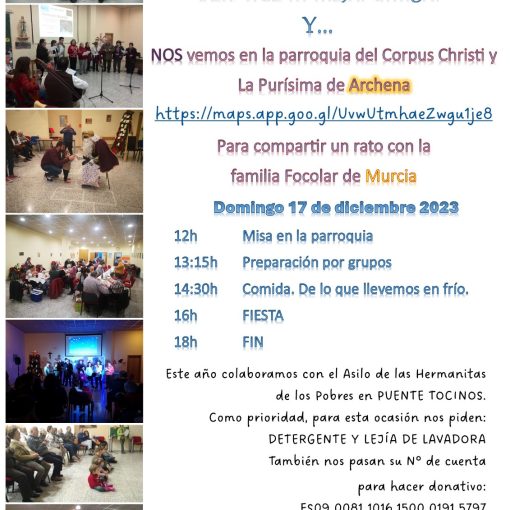 “El encuentro fue muy bonito. Éramos unas ochenta personas entre niños, unos doce, familias jóvenes y varias personas de fuera de la comunidad sufí, algunos de la comunidad Bajai, de otra iglesia cristiana, algunos católicos y entre ellos, nosotros del Movimiento de los Focolares. En este caso de las comunidades de Murcia y Aljucer.
