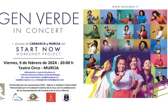 El Teatro Circo acogió el espectáculo “Gen Verde In Concert” en el que participaron una veintena de jóvenes que participaron en los talleres del proyecto Start Now El grupo está compuesto por 19 mujeres de catorce nacionalidades diferentes Cantando ante la Vera Cruz de Caravaca. El Gen Verde finalizó su gira de diez días por tierras murcianas participando en la Misa del Peregrino en la basílica de la Vera Cruz de Caravaca. Unos 600 fieles entre los que se encontraban un centenar de personas de las comunidades locales del Movimiento de los Focolares de Aljucer, Archena, Caravaca de la Cruz, Cartagena y Murcia. Murcia. 11-02-2024